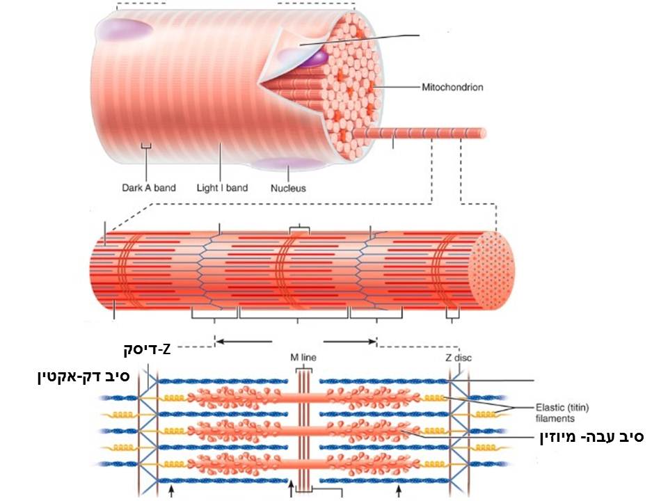 בתמונה ניתן לראות את מבנה שרירי השלד. כל שריר מורכב ממבנים הנקראים סרקומרים. כל סרקומר מורכב מסיבי אקטין ומיוזים המסודרים במקביל זה לזה, כאשר ישנו אזור בהיר (ללא מיוזין) המכונה z-disk.
