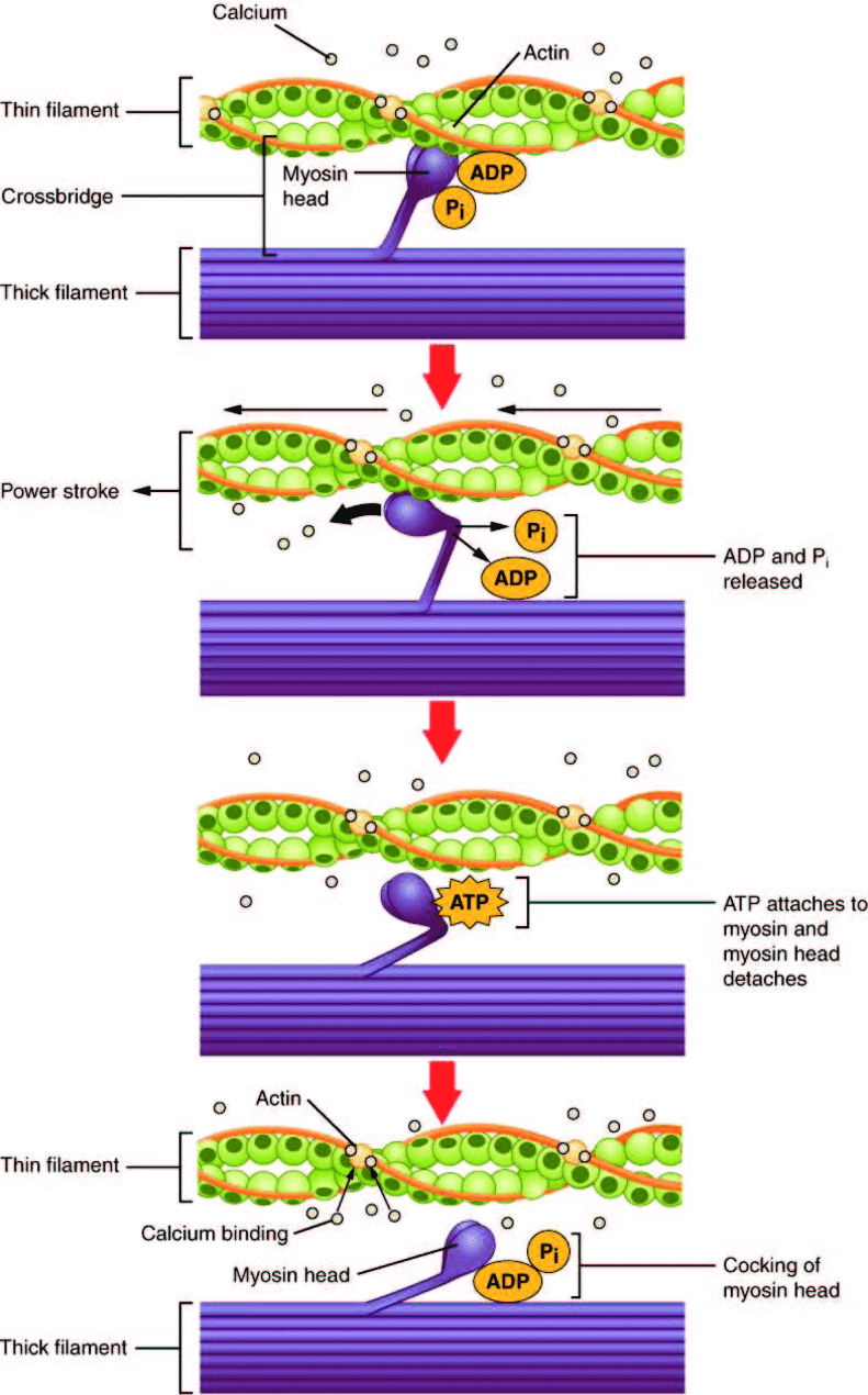 ארבעת שלבי השיקור של אקטין ומיוזין היוצרים את המנוע הכימי להנעת השריר