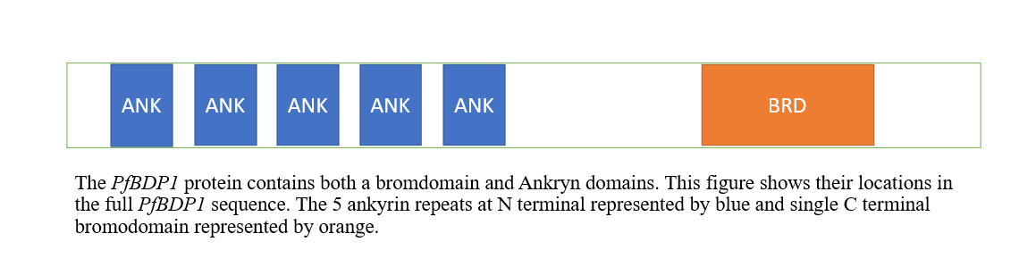 Figure: The PfBDP1 protein contains both a bromdomain and Ankryn domains. This figure shows their locations in the full PfBDP1 sequence. The 5 ankyrin repeats at N terminal represented by blue and single C terminal bromodomain represented by orange.��
