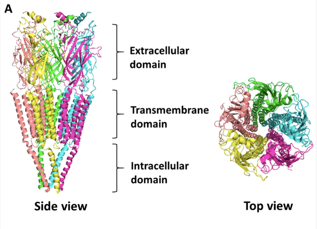 ECD, ICD, and TMD of the alpha-7 nicotinic acetylcholine receptor.
