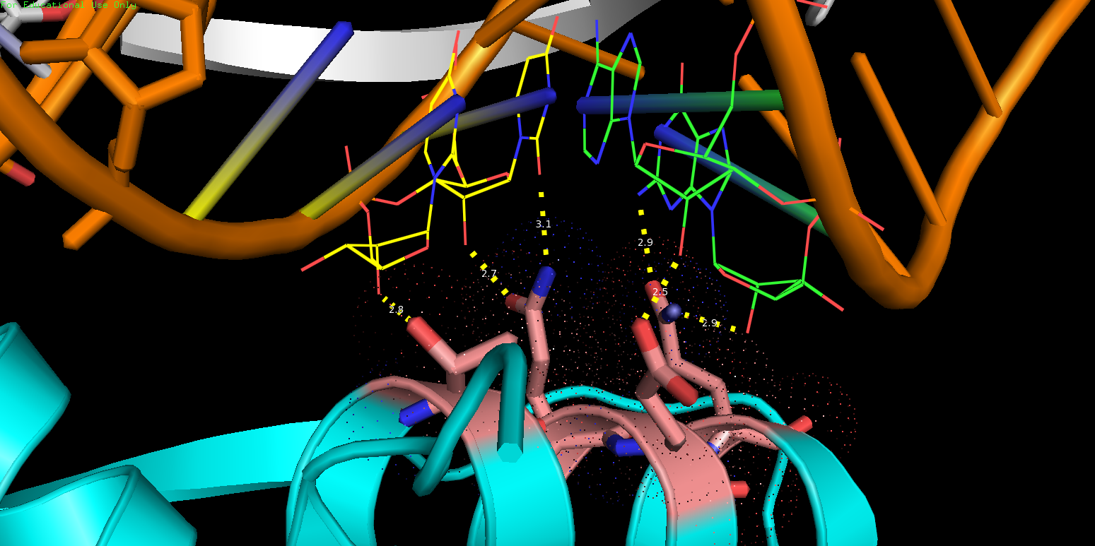 A close-up view of the RNase III-RNA binding site of TM-RNase (pdb code: 1O0W), showing interacting residues and their distances. Image created using Pymol.