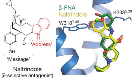The Trp318 residue selects against certain structures that could otherwise bind if it were a leucine as in the δ-OR. I do not own this image, it is property of Nature and the authors, used for academic purposes only: Aashish, Manglik, et al. "Crystal Structure of the µ-opioid Receptor Bound to a Morphinan Antagonist." Nature 485.7398 (2012): 321-26. Nature.com. 21 Mar. 2012. Web. 27 Nov. 2012.