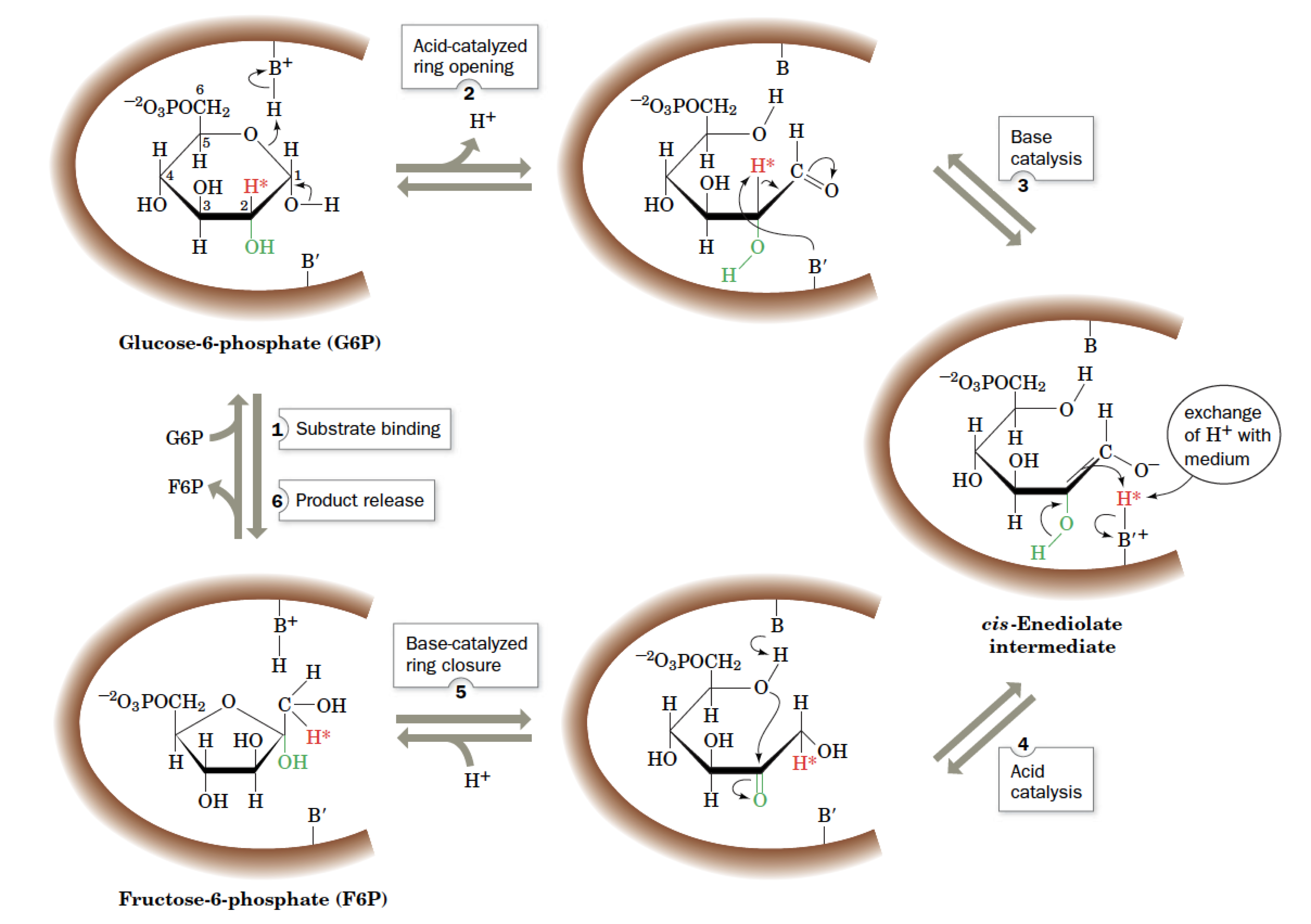 Fig Legend FIG. 15-3 The reaction mechanism of phosphoglucose isomerase. The active site catalytic residues, BH+ and B′, are thought to be Lys and His, respectively.