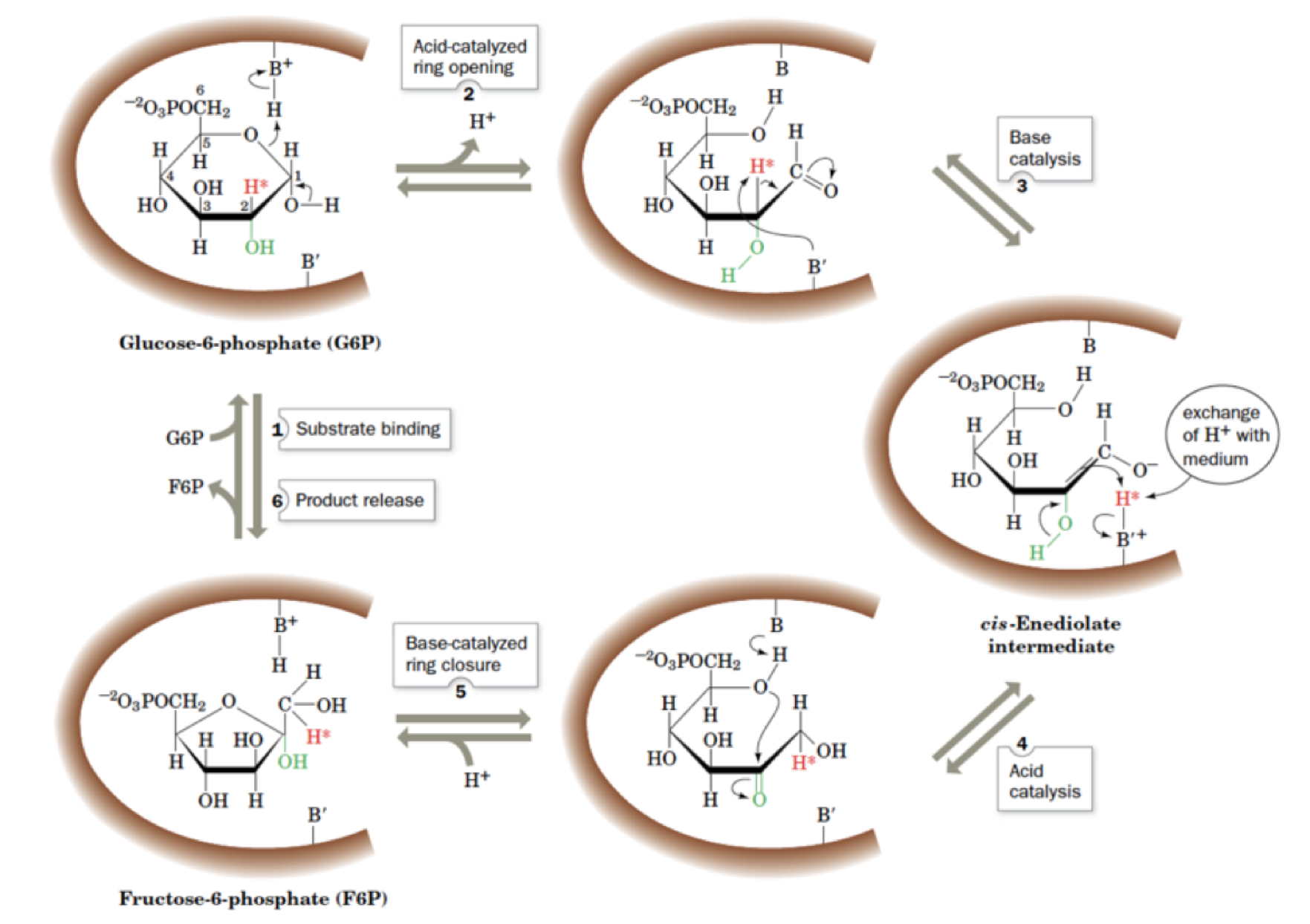 Fig Legend FIG. 15-3 The reaction mechanism of phosphoglucosisomerase. The active site catalytic residues, BH+ and B′, are thought to be Lys and His, respectively.
