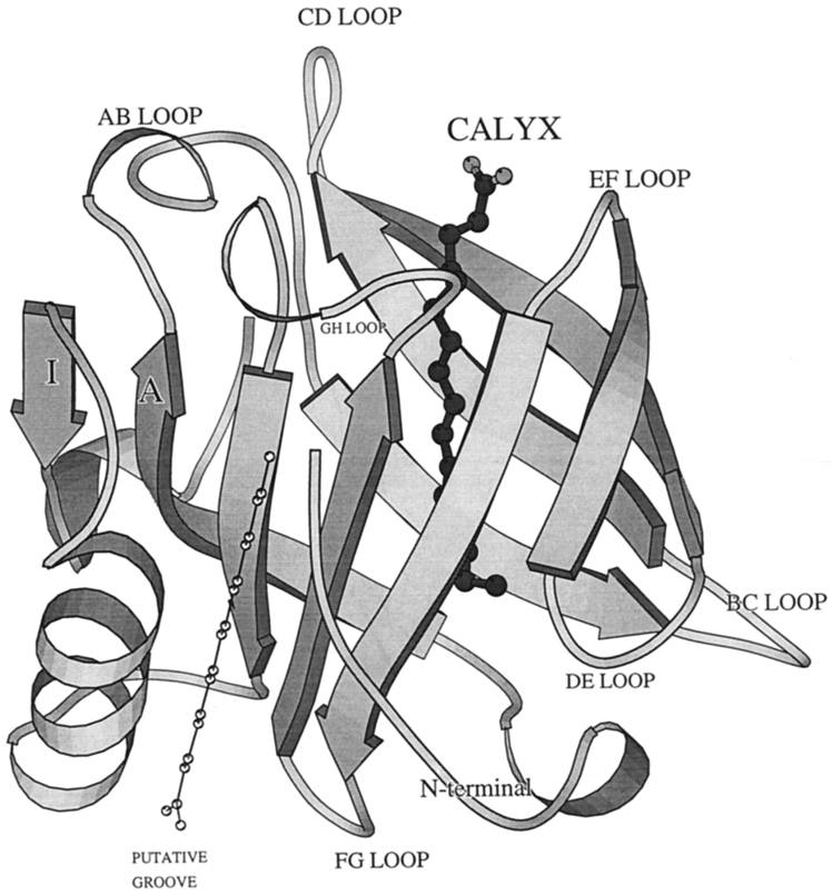 A general view of b-lactoglobulin, a typical lipocalin. The binding site (filled atoms) is shown in the central calyx, and the putative binding site (open atoms) is indicated on the outer surface of the protein. The structurally conserved regions are at the rear of the molecule on strand A, the FG loop, and the loop before the a-helix.(Wu S et al. J. Biol. Chem. 1999;274:170-174)