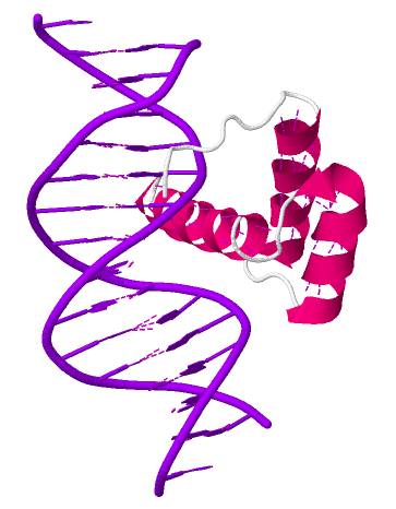 This PDB structure corresponds to the PDX-1 homeodomain. This part of the transcription factor folds into three α-helices (pink color) and a flexible N-terminal arm (white-grey color). This homeodomain interacts with DNA (purple color).