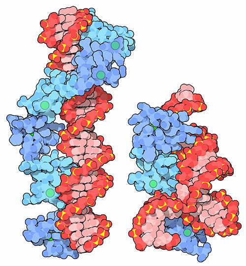 Many zinc fingers play essential roles in DNA recognition. Zinc fingers were originally discovered in the transcription factor TFIIIA from frog eggs, which contains nine zinc fingers in a row. The two structures shown here capture pieces of this protein performing its functions. PDB entry 1tf6, shown on the left, includes 6 of the zinc fingers (blue) bound to a long stretch of DNA (red). With this interaction, TFIIIA helps control the transcription of the gene for a ribosomal RNA. TFIIIA also binds to the ribosomal RNA itself, as shown in PDB entries 1un6 and 2hgh, on the right. These structures include 3 of the 9 zinc fingers (blue), along with a small piece of the ribosomal RNA (red). In the frog eggs, about 10 billion copies of this protein help to stabilize the many copies of RNA as the cell develops.