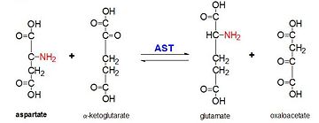 Aspartate Aminotransferase (AST), also know as Glutamic aspartic transaminase, glutamic oxaloacetic transaminase, and transaminase A., is an enzyme that is a member of the class-I pyridoxal-phosphate-dependent aminotransferase family.It is coded by the gene GOT1. It is a homodimer that is 413 amino acids long and serves a critical role in amino acid metabolism. Within prokaryote cells it is exclusively found in the cytosol, but in eukaryotic cells there are cytosol and mitochondrial isozymes.