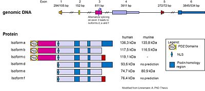 The protein myopodin (encoded by the gene SYNPO2[1]), also called genethonin-2, synaptopodin-2, synaptopodin-like and fesselin, was first described in 2001 by Weins et al., and shown to be widely expressed in striated- and smooth-muscle cells [1]. At least six isoforms result from alternative splicing and the predicted size of the resulting proteins varies between 76 kDa and 136 kDa; these variants show differential tissue distribution. The discrepancy between calculated molecular mass and apparent mobility in SDS-PAGE is at present still unclear, but might be due to post-translational modifications [2] [3] [4] [5] [6].