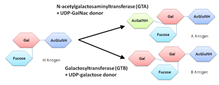 An N-acetylgalactosaminyltrasferase (GTA) uses a UDP-GalNac donor to convert the H-antigen acceptor to the A antigen, whereas a galactosyltransferase (GTB) uses UDP-galactose donor to convert the H-antigen acceptor to the B antigen.