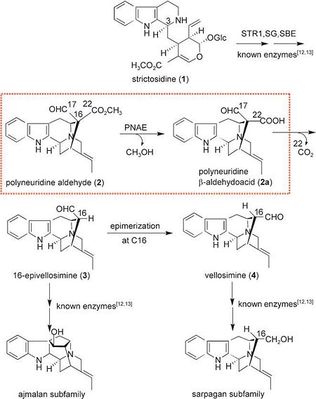 | - | '''Polyneuridine Aldehyde Esterase''''''(PNAE)''' is an important enzyme during Ajmaline Biosynthesis, transforming C-10 skeleton polyneuridine aldehyde into C-9 skeleton epi-vellosimine<ref>PMID:12071952</ref>.[[Image:Pathway.JPG]] | + | '''Polyneuridine Aldehyde Esterase''''''(PNAE)''' is an important enzyme during Ajmaline Biosynthesis, transforming C-10 skeleton polyneuridine aldehyde into C-9 skeleton epi-vellosimine<ref>PMID:12071952</ref>. |