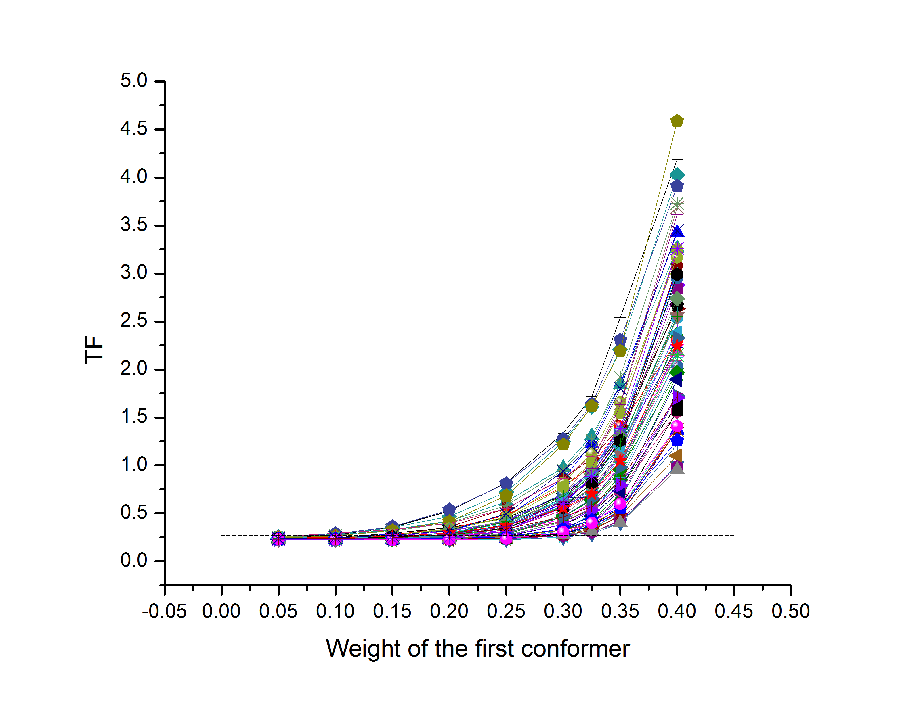 (uploaded a new version of "Image:MO profiles.png": Discrepancy between the experimental data and the data calculated for the model ensemble plotted against the weight of the selected conformer.)