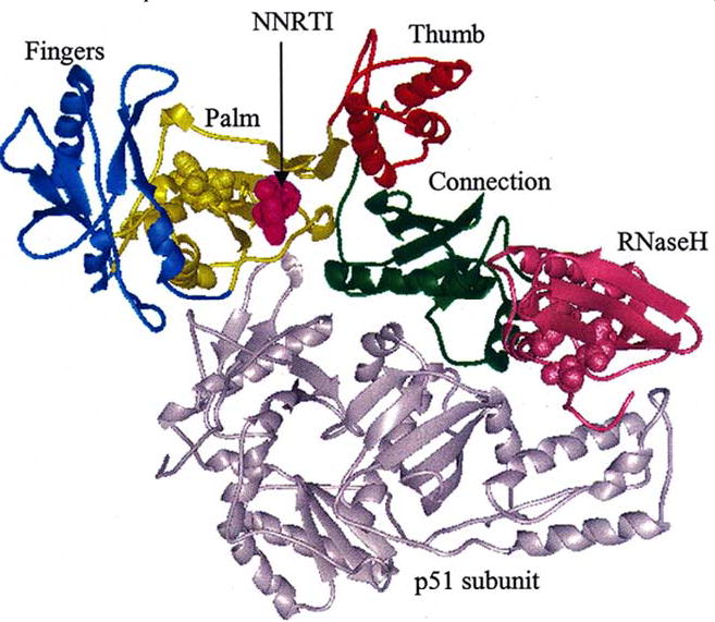 (This image shows the palm, thumb, finger, connection, and RHase H subdomains making up the p66 subunit of RT. This is reproduced from Sluis-Cremer, N et al. Conformational changes in HIV-1 reverse transcriptase induced by nonnucleoside reverse transcripta)