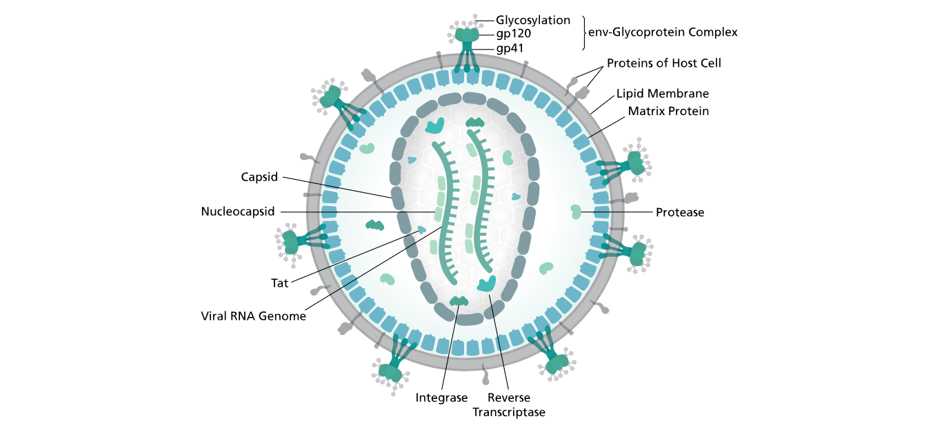 Figura 1. Estructura del VIH. https://commons.wikimedia.org/wiki/File:HI-virion-structure_en.svg