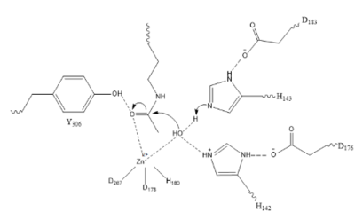inhibits the HDAC 8 by competition inhibition by making a favorable bidentate interaction with the Zn2+ Ion and makes strong interactions with the Asp101. | inhibits the HDAC 8 by competition inhibition by making a favorable bidentate interaction with the Zn2+ Ion and makes strong interactions with the Asp101. | ||