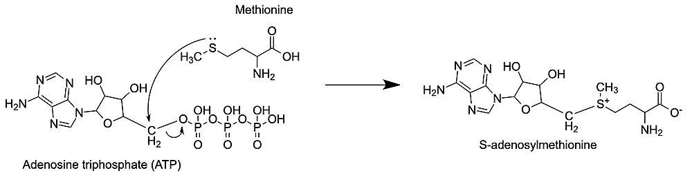 For higher resolution, see [Image:Sam rxn 2.png|1000pix]. The slightly negative sulfur atom of methionine undergoes a nucleophilic attack on the slightly positive 5th carbon of the adenosine sugar unit. Following this, the bond from the 5th carbon to the oxygen breaks, separating the tripolyphosphate from the newly formed S-adenosylmethionine (SAM) <ref name="Murray et al.">Murray B, Antonyuk SV, Marina A, Lu SC, Mato JM, Hasnain SS, Rojas Al. Crystallography captures catalytic steps in human methionine adenosyltransferase enzymes. PNAS. 2016 Feb 8;113 (8) 2104-2109. doi: https://doi.org/10.1073/pnas.1510959113</ref>. This is an example of an SN2 reaction, where an intermediate forms as the substrates are transitioning to their product forms. The product is only released after the methionine binds and the C-O bond breaks. | For higher resolution, see [Image:Sam rxn 2.png|1000pix]. The slightly negative sulfur atom of methionine undergoes a nucleophilic attack on the slightly positive 5th carbon of the adenosine sugar unit. Following this, the bond from the 5th carbon to the oxygen breaks, separating the tripolyphosphate from the newly formed S-adenosylmethionine (SAM) <ref name="Murray et al.">Murray B, Antonyuk SV, Marina A, Lu SC, Mato JM, Hasnain SS, Rojas Al. Crystallography captures catalytic steps in human methionine adenosyltransferase enzymes. PNAS. 2016 Feb 8;113 (8) 2104-2109. doi: https://doi.org/10.1073/pnas.1510959113</ref>. This is an example of an SN2 reaction, where an intermediate forms as the substrates are transitioning to their product forms. The product is only released after the methionine binds and the C-O bond breaks. | ||