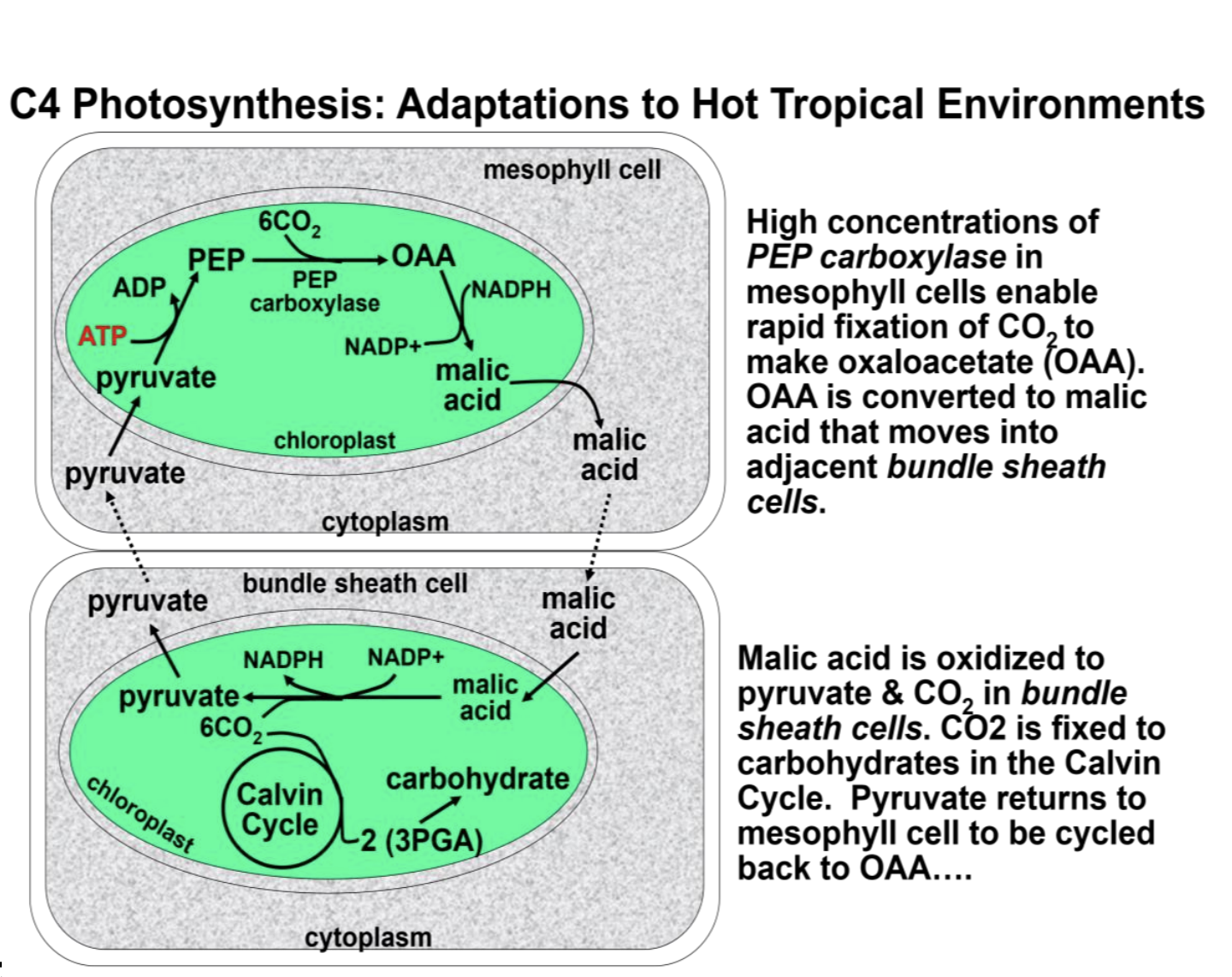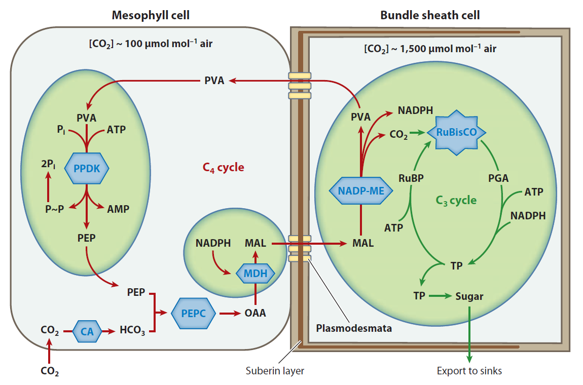 Diagrammatic representation of the C4 photosynthetic pathway as it occurs in plants of the NADP-malic enzyme (NADP-ME) subtype. Adapted from Sage RF, Sage TL, Kocacinar F. Photorespiration and the evolution of C4 photosynthesis. Annu Rev Plant Biol. 2012;63:19-47. PMID:22404472 doi:10.1146/annurev-arplant-042811-105511