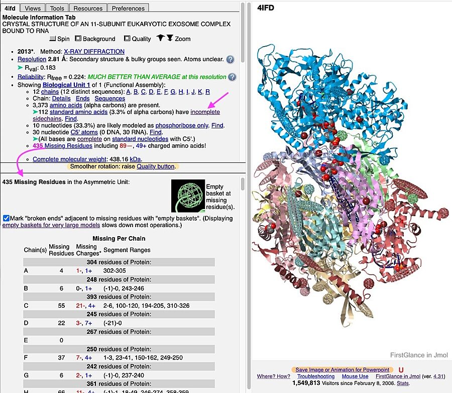 Regions with missing residues are clearly marked with "empty baskets" when a PDB ID model is displayed in FirstGlance in Jmol, as shown above. FirstGlance offers to report the total number missing, and the resulting number of missing charges in a detailed report, which also lists all the missing residues (from PDB file REMARK 465).