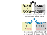 The kink-turn motif is a common RNA structural motif that consists of helix–internal loop–helix motif that introduces a very tight kink into the helical axis, as illustrated in the 3D structure window the left. Originally identified in the course of analyzing the large ribosomal subunit[1], this RNA structural motif was also identified in other RNAs. Particular instances have been called the GA motif [2]. The kink-turn motif includes the A-minor motif. Many kink-turns bind proteins; however, that trait is not universal. They can mediate RNA tertiary structure interactions as well.